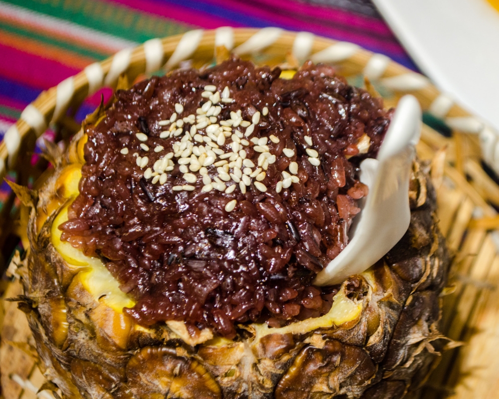 Cơm dứa cũng là đặc sản Côn Minh mà du khách nên nếm thử. Đây là món ăn đặc trưng của dân tộc Thái nói riêng và tộc người sinh sống ở vùng Vân Nam nói chung. Điểm đặc biệt của món ăn này đến từ các loại cơm thập cẩm, xôi ngũ sắc của người Thái. Cơm dứa là nghệ thuật kết hợp của gạo, hạnh nhân, nho khô và dứa, tạo ra hương vị độc đáo và thơm ngon mà không thể tìm thấy ở bất kỳ nơi nào khác.